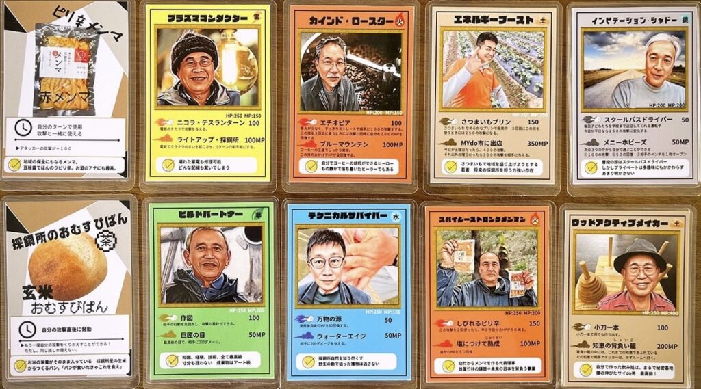 カードのモデルは、電気工事のベテラン・スクールバスの運転手・メンマ作りの名人・木工の達人など——長年その町で役割を担い、責任を積み重ねてきた人たち。